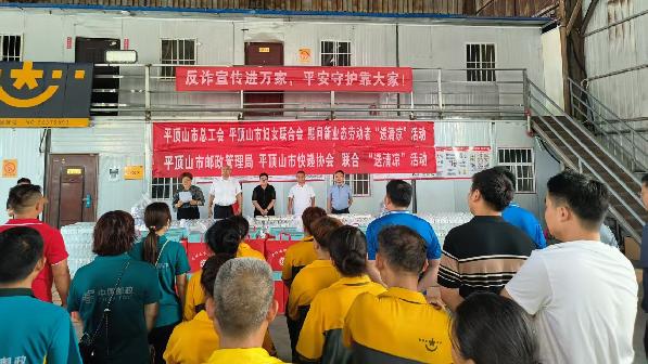 平顶山局联合市总工会、市妇联、市快递协会开展“送清凉”活动。(朱钰清)